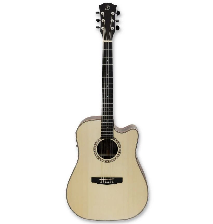Gitara o kształcie dreadnaught czyli najpopularniejszym kształcie gitar akustycznych. Duże pudło oferuje mocny i potężny dźwięk z wyraźnymi basami - trudno o lepszy instrument do gry akordowej i flatpickingu. Wycięcie cutaway daje swobodny dostęp do wysokich pozycji na gryfie.