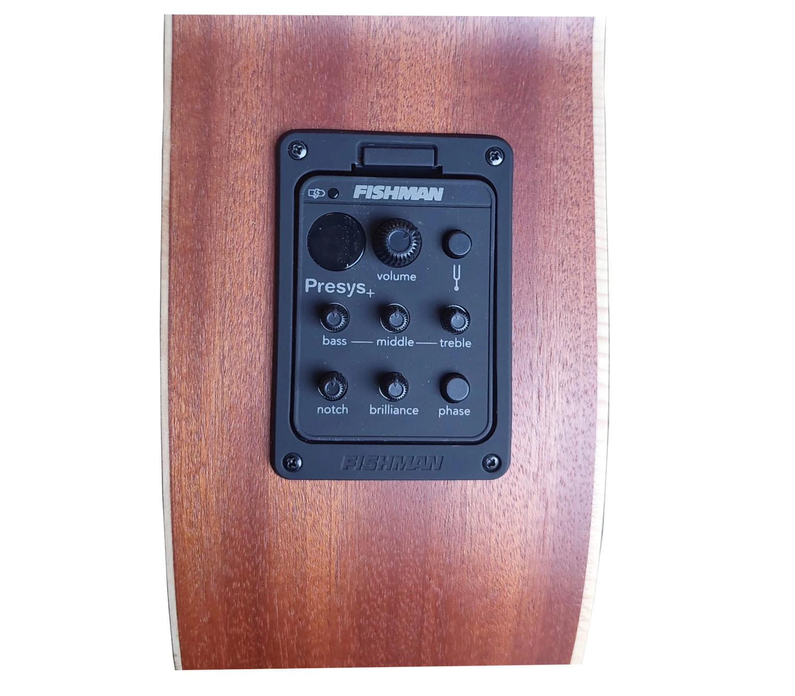 - Wizualnie instrument jest identyczny jak poprzednik. Elegancka rozetka na świerkowym topie, reszta korpusu stworzona z drewna sapele, brak bindingu i niepotrzebnych ozdobników.