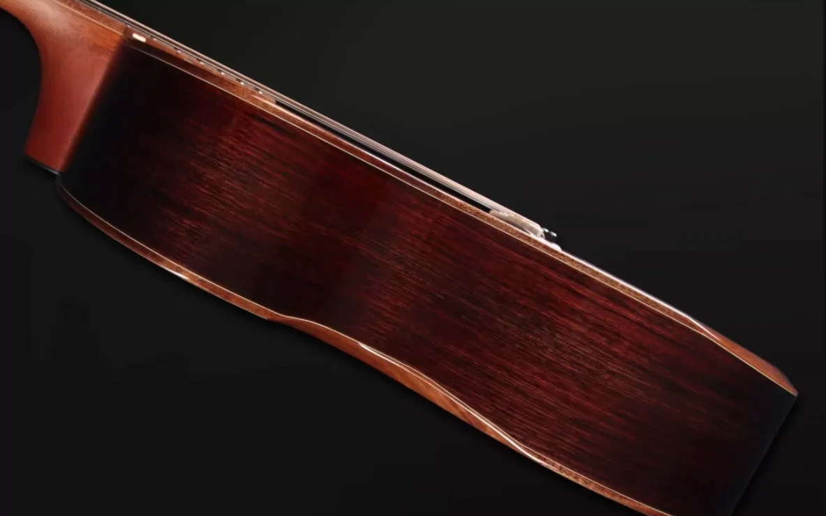 Gitara została wykończona cienkim, rezonansowym lakierem Full-Pore High-Gloss Finish, który podkreśla naturalne piękno drewna i wspiera swobodną pracę pudła rezonansowego. Luksusowy charakter instrumentu dopełniają detale z koa, abalone i masy perłowej, podstrunnica oraz mostek z wzorzystego ziricote, a także eleganckie markery w formie rzymskich cyfr.