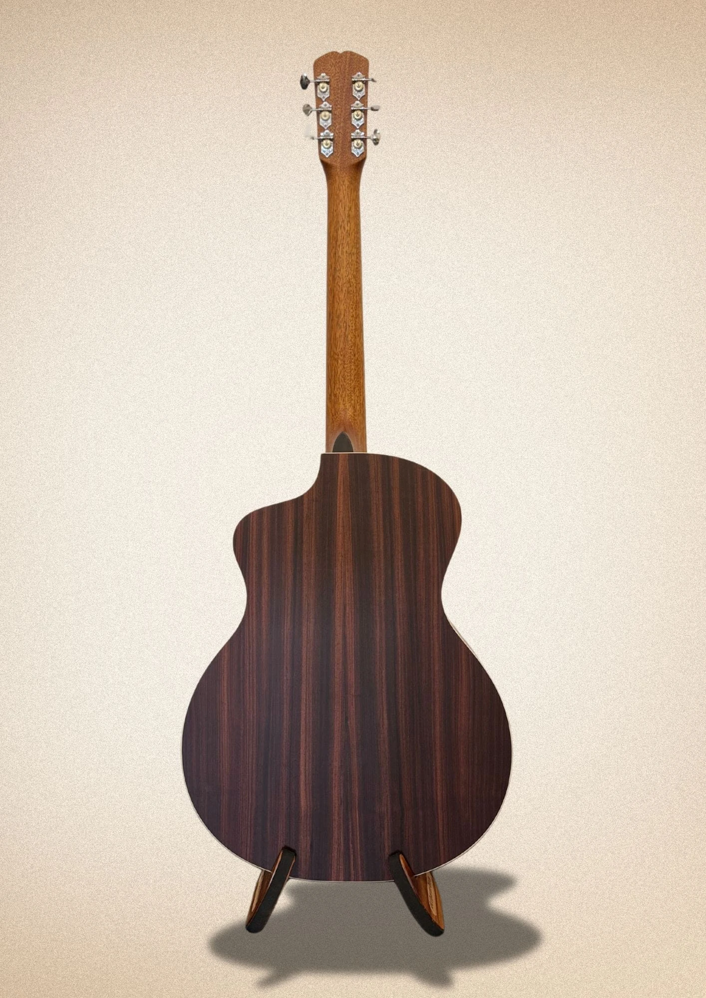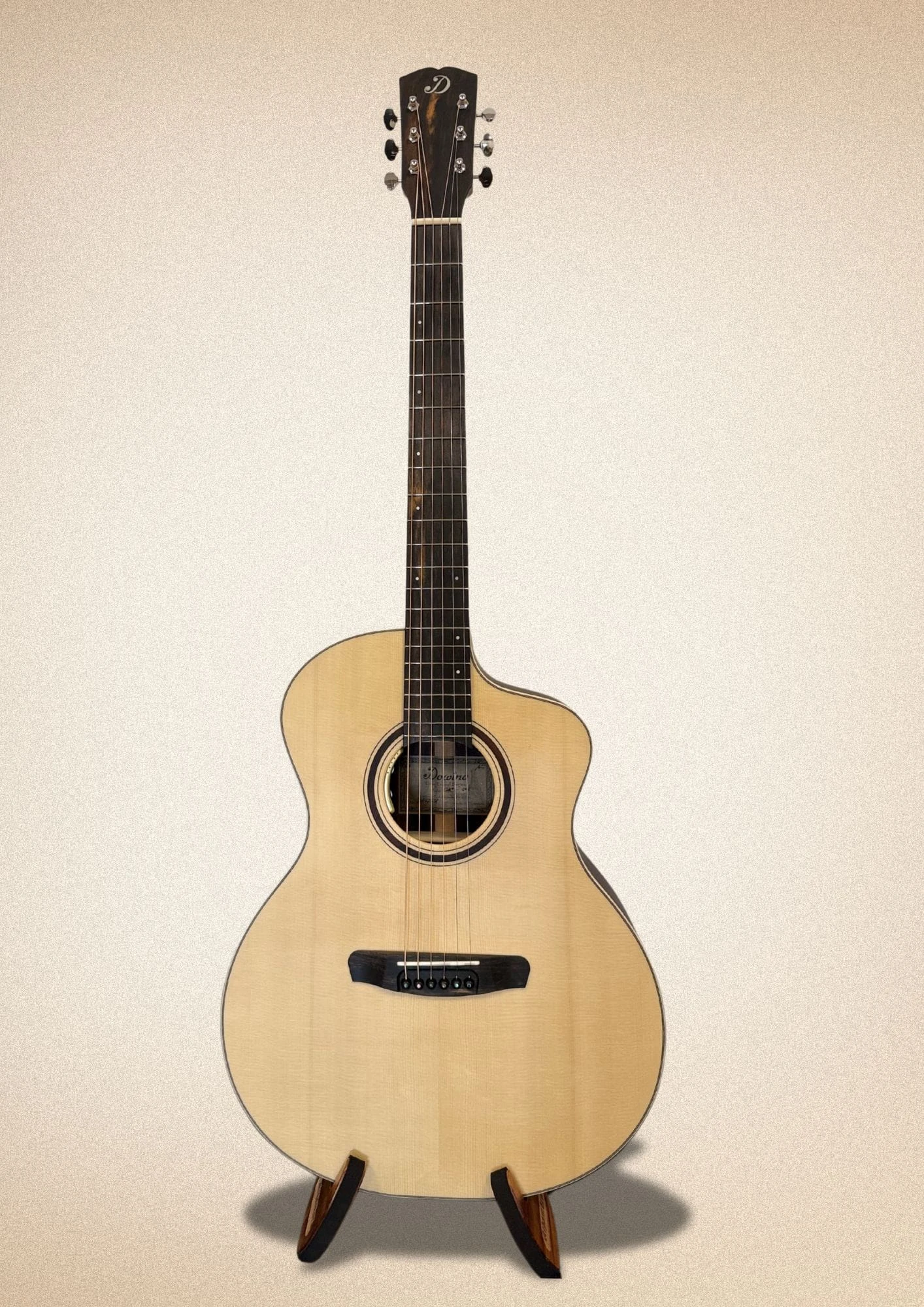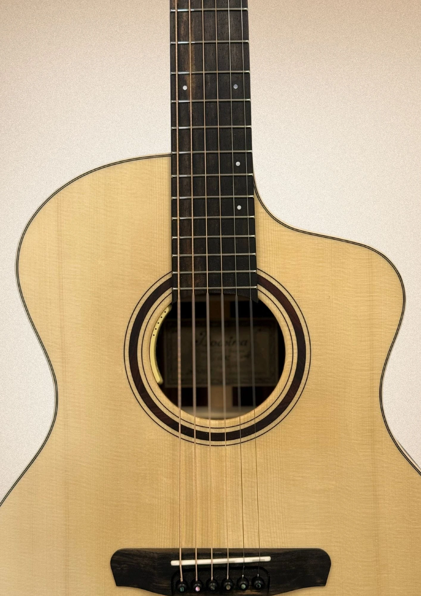 Płyta wierzchnia: Swiss Moon Spruce – szwajcarski świerk księżycowy, znany ze swojej lekkości i wyjątkowej responsywności. Drewno to jest wybierane i ścinane w określonej fazie księżyca, co ma wpływać na jego stabilność i właściwości akustyczne.