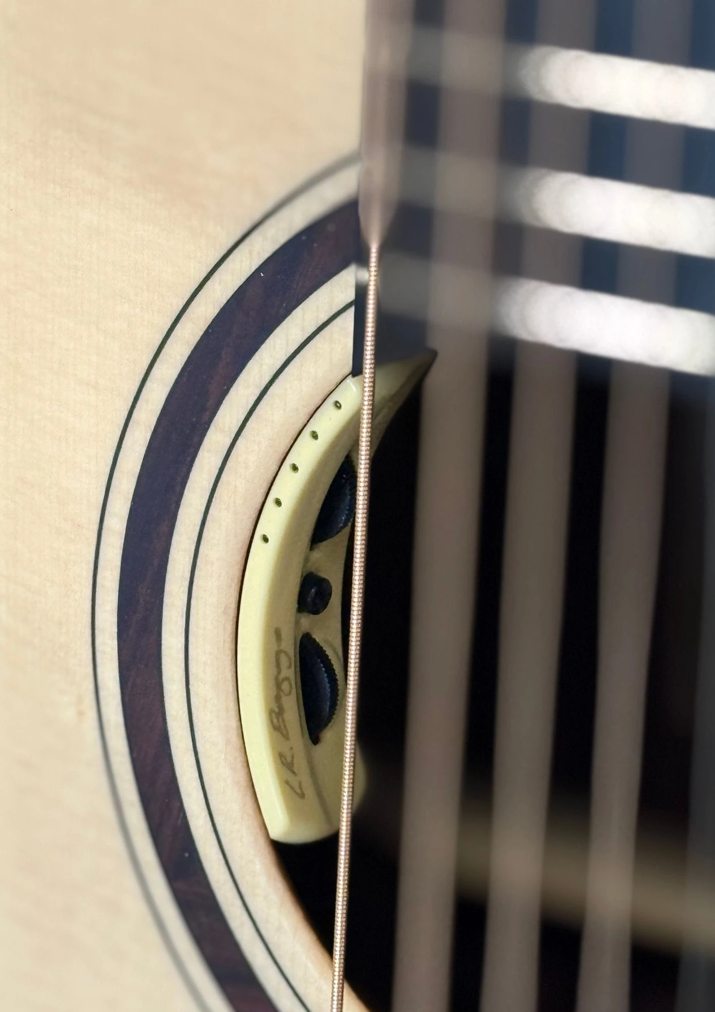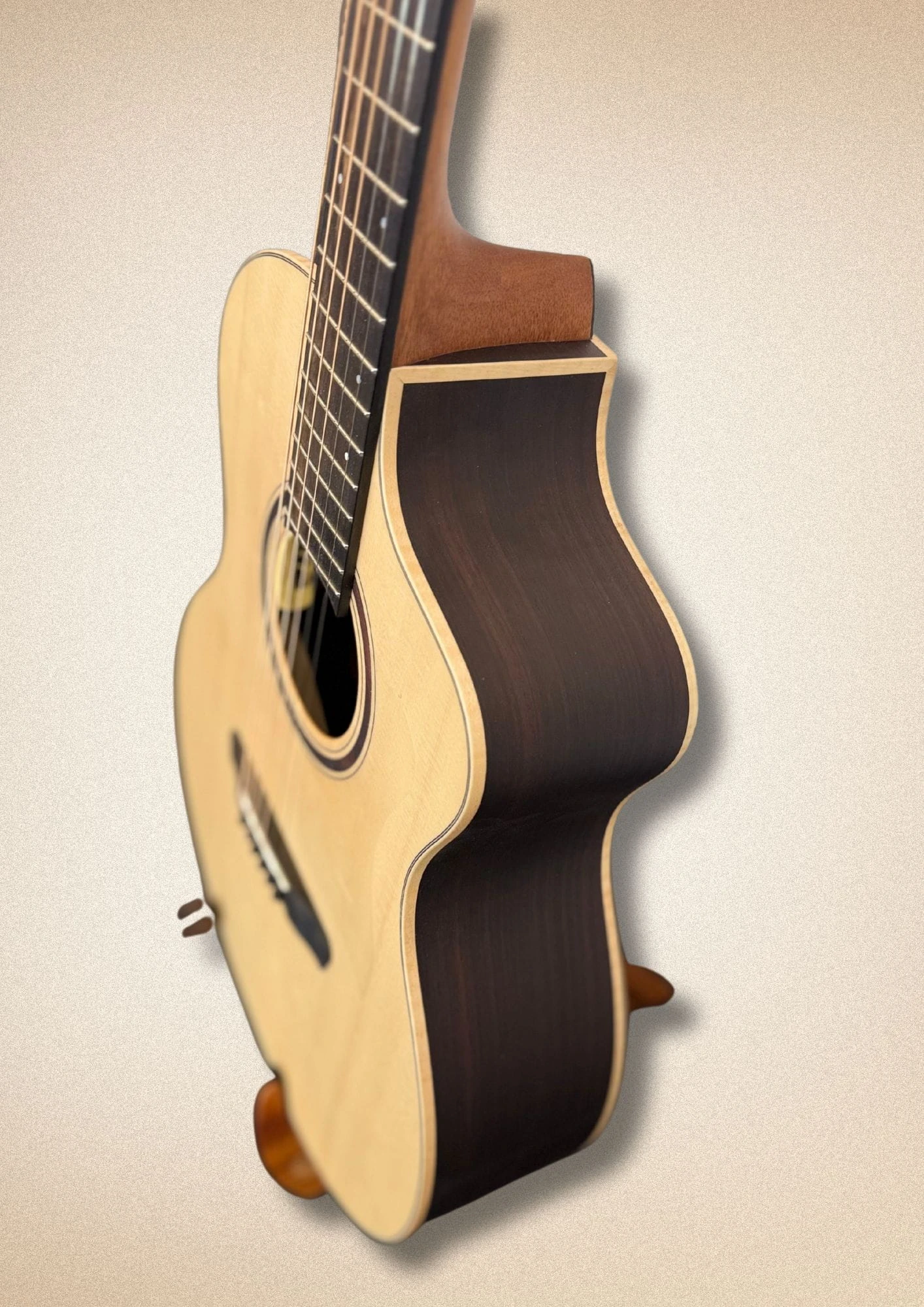 Otoczenie otworu rezonansowego: Palisander indyjski – elegancki detal podkreślający spójność estetyczną instrumentu.
